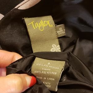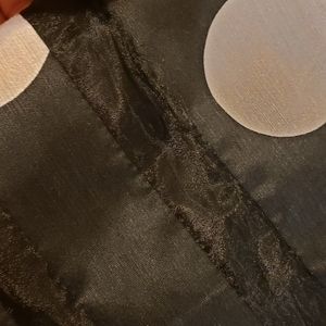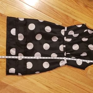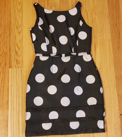This somehow has just the most feminine, sexy look and fit when on. Attached belt with bow at waist. Back goes into a V (not deep) and there are a few covered buttons. Then a zipper Therea a tiny tear in the tulle trim on bottom But it's not noticeable at all. Personally I'd never bother to fix it. But still just wanted to disclose prior to any purchase. Dots are a light silvery gray color. Dress black