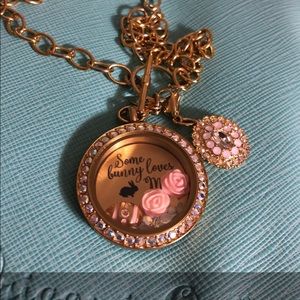 The set comes with a large Gold twist locket base, a large gold face with AB (Aurora Boreales) Swarovski Crystals, a large gold plate “Some bunny loves me”, 2 pink pastel roses charms, 1 egg charm, a pastel crystals stardust, a gold toggle chain, and a beautiful gold vintage dangle.