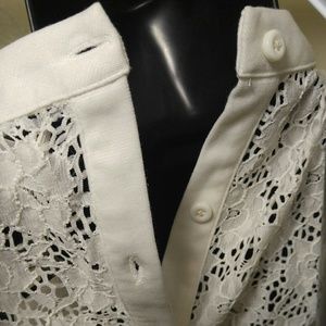 Sleeveless curve hugging dress features a lace yoke and high neckline. Partial peplum detail on waist. Lower back is cut out, top back of dress buttons, and lower back zips.