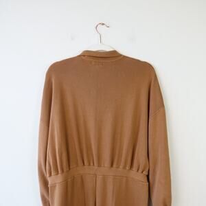 Camel brown knit material, large buttons up the front, collared, cinched waist, cuffed sleeves and legs.