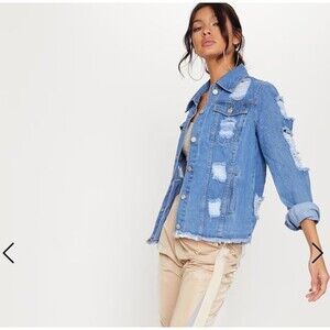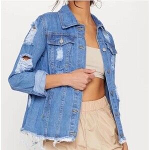 Pretty Little Thing ABEGAILA MID WASH DISTRESS OVERSIZED DENIM JACKET jean Sz 2