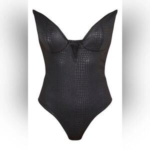 Pretty Little Thing Black Faux Leather Croc Deep V Bodysuit Size 10 NWT