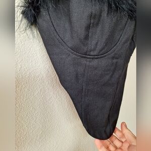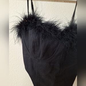 Pretty Little Thing black feather trim on black denim mini top. Spaghetti straps. Back zip closure. Womens size 6 Pit to pit flat lay 15.5 " length from neckline to center front middle 12" measurements are approximate