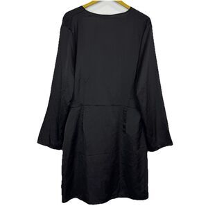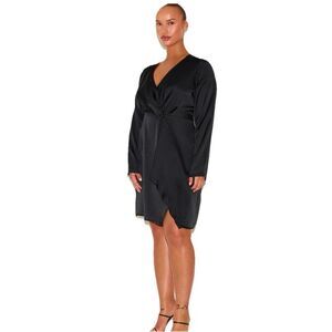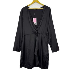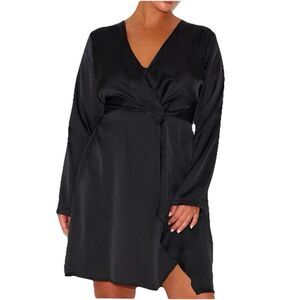 Pretty Little Thing Black Satin Long Sleeve Wrap Babydoll Dress Size XL V-Neck