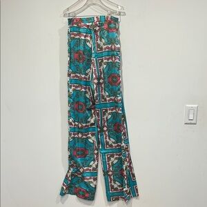 Vibrant wide-leg pants with a bold pattern. Features teal, pink, and white colors.
