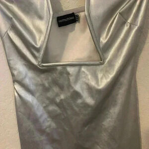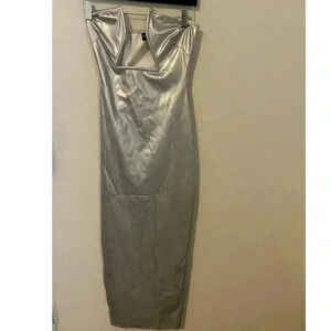 Add a little attitude to your weekend wardrobe with this dress. Featuring a silver PU material with an extreme V bar design and a midaxi length. Wear with your fave heels and simple accessories to have heads turning for all the right reasons.