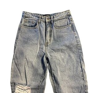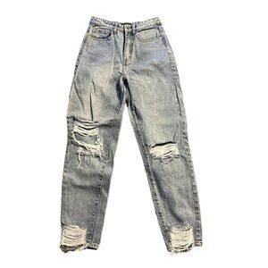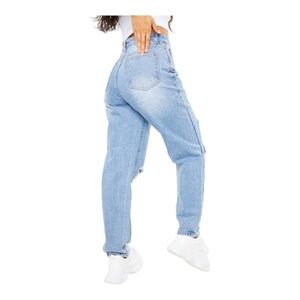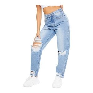 Pretty Little Thing Light Blue Wash Extreme Distressed Hem Knee Rip Mom Jeans 6