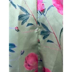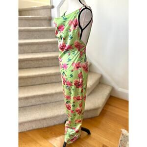 Good pre-owned condition, small run in fabric at waist near the seam, and at the base of the back zipper. Neither are overly noticeable. Lime green, hot pink flowers through out. Backless, cowl neck. Column style with slight taper to the ankles.