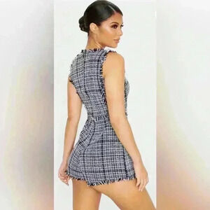 Pretty Little Thing Monochrome Tweed Fringe Romper Size 6 Black & White NWT