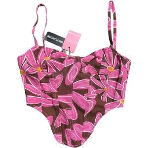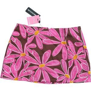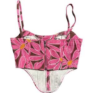 Two-piece matching set in brown denim with bold pink daisy floral print. Includes a fitted micro mini skirt with back zip closure and a structured corset-style cami top with adjustable straps. Still new with tags, never worn.