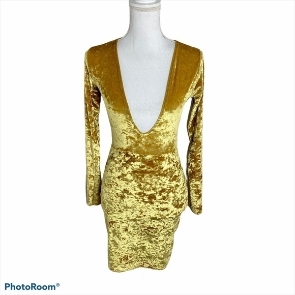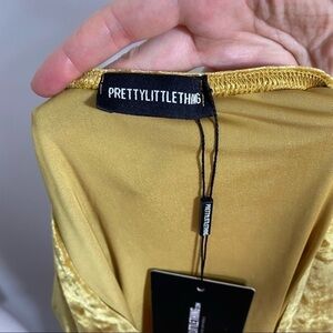 Pretty Little Thing Plunge Neckline Dress NWT 10 Velvet Yellow Gold Long Sleeve