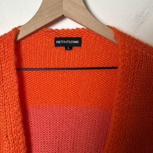 Make a bold style statement with this Pretty Little Thing oversized cardigan sweater. Featuring a multicolor stripe pattern in vibrant shades of orange, gray, and pink, this long, cozy cardigan offers a trendy, relaxed fit. Designed with balloon sleeves for added flair, this size S sweater is perfect for layering over any casual outfit for a chic and cozy look.