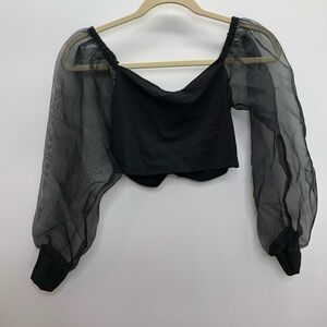 Black Bardot crop top. Sheer organza puff sleeves. Gathering down center.