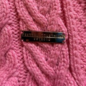 Stylish pink cable knit scarf featuring fringe detailing. Perfect for adding a pop of color to any outfit.