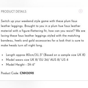 Pretty Little Thing plum faux leather leggings, size 10, inseam 35.5 inches long