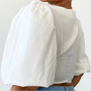 Pretty Little This white woven puff sleeve structured crop top, size 20. This top is made of a white woven material with a button design and puff sleeves. It’s perfect to wear with high waisted jeans. It flat lay measures 21” pit to pit and 16” shoulder to hem.