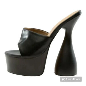 Unleash your inner Bratz with these Pretty Little Things platform heels. These ultra-high heels feature a sculptural cone heel and peep toe style, perfect for any occasion from weddings to casual outings. The faux leather upper material in classic black color, make these shoes a timeless addition to any wardrobe.