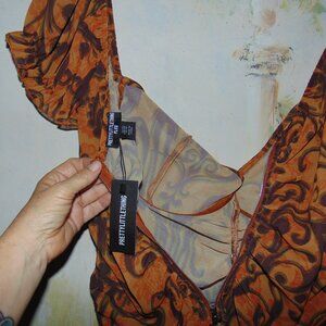 Add a touch of bohemian coquette charm to your wardrobe with this new Pretty Little Things corset top in size 16. The top features a beautiful fleur de lis scrolls geometric pattern on a semi-sheer polyester fabric, perfect for any occasion from travel to parties or casual outings. The sweetheart neckline and puff sleeves with ruffle sleeve hem add a feminine touch, while the zipper back closure gives it a sexy and modern twist. The cropped style and lettuce hem sleeves make it a perfect fit for any season, from winter to summer. This corset top is a must-have for any fashion-forward woman who wants to add a touch of Lolita and 90s coquette vibe to her wardrobe.Semi Sheer Brown and Orange