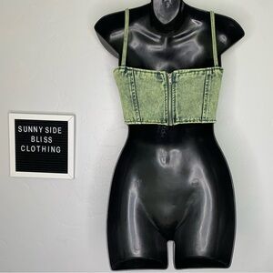 This is a green denim corset top with a back zipper. It’s in great pre owned condition no stains or flaws.