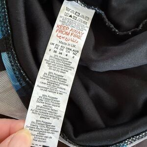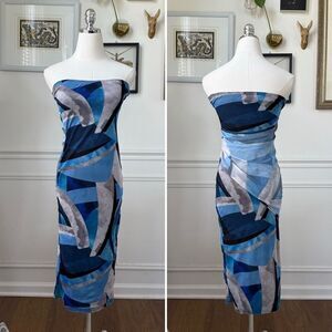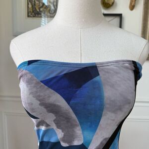 PrettyLittleThing tube midi dress in body con style. Mesh overlay is abstract shades or blue and grey print. Lined. Super stretchy polyester and elastane blend. Laying flat measures approximately 37” top to hem, almost 12 inches straight across the waist and 13” armpit to armpit. Lots of flexibility to the fabric.