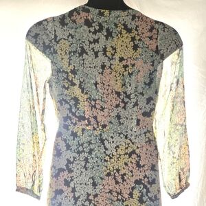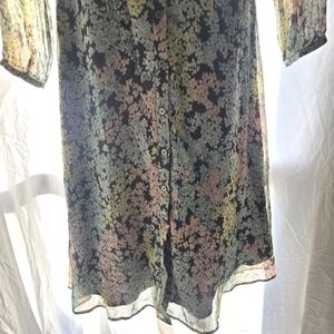 Long sleeve, button front, v neckline, figure flattering, maxi length. Very nice.