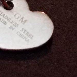 Bracelet measures 7 inches, and another inch can be added by way of the attached extender. Closure is a lobster claw, and a heart-shaped hang tag is stamped "GM Stainless Steel Made in China"