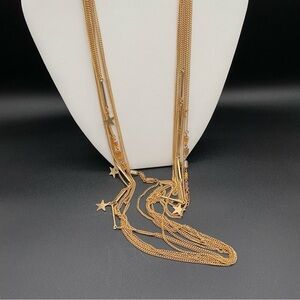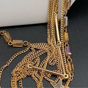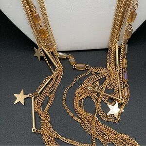 Dainty gold tone necklace with 7 strands of cable chain and bar chain with star pendants with Swarovski crystal amber yellow glass beads. Just gorgeous and dainty.