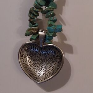 Gorgeous set! The necklace is done with genuine turquoise beads and showcases a pretty silver textured heart pendant. The pendant measures 2" in length and 1.5" in width at its widest point. The necklace is 18" in length with a 3" chain extender and lobster claw clasp closure. The matching heart dangle earrings are 1" in length and have ear wire hook closures.