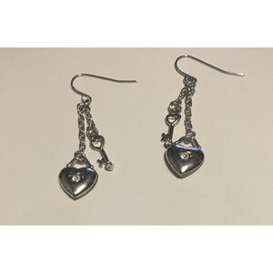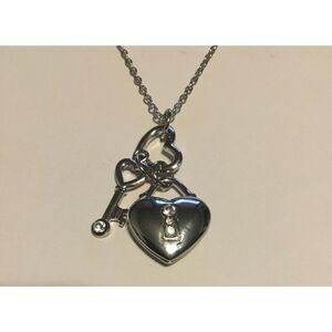 This beautiful necklace and earring set features lots of hearts and keys done in a high polished sterling silver plate finish and sparkling with rhinestones. The 27” necklace can be worn long or can be doubled up for a shorter look. It has a 3” extender and lobster claw clasp closure. The matching dangle earrings are 2.5” in length and has ear wire hook closures.