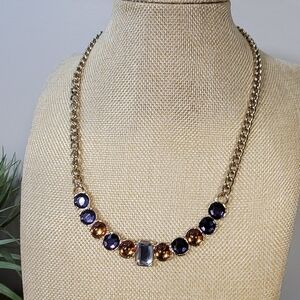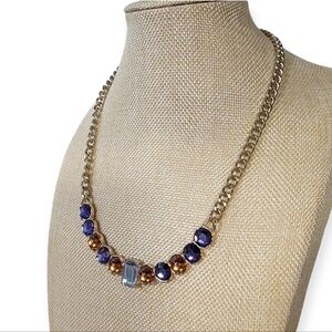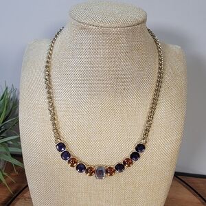 Pretty blue and orange fashion gems necklace with Gold tone chain. Perfect for wearing to your favorite orange and blue teams games.