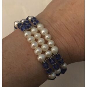 This new stretch style bracelet is both comfy and gorgeous. At 3/4” in inch, a triple row design features simulated pearls and sapphire blue crystal stations. It has an expensive look and feel which make it a bracelet you will wear many times. It also makes a great gift idea!