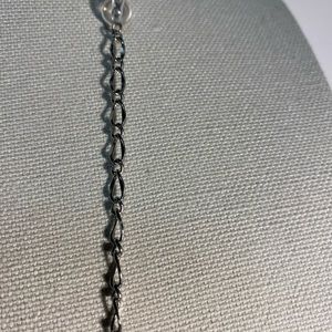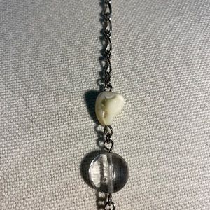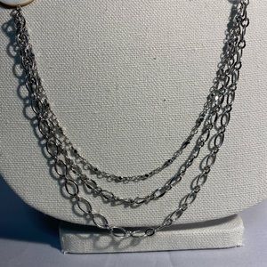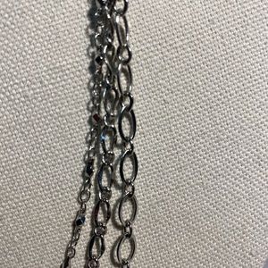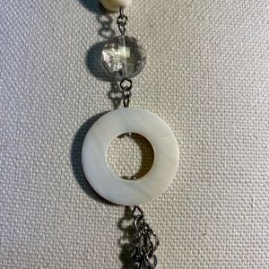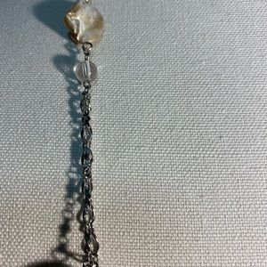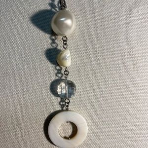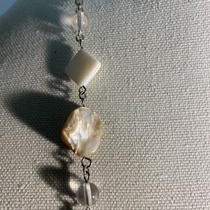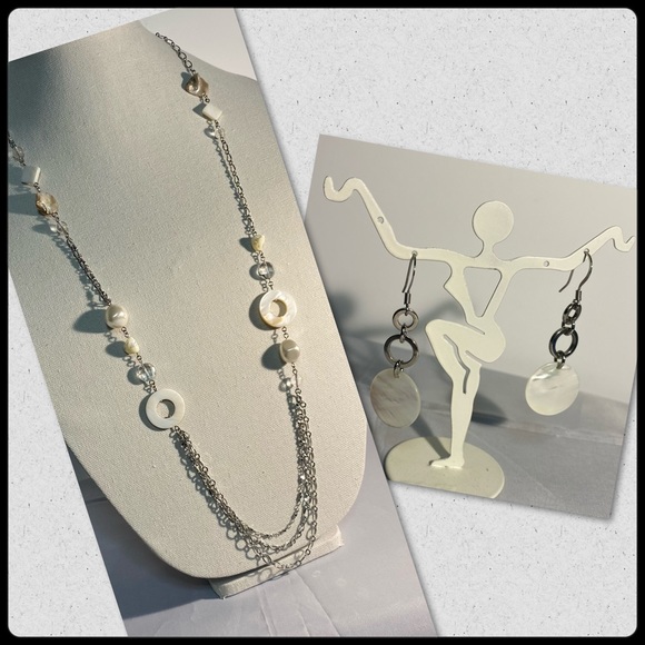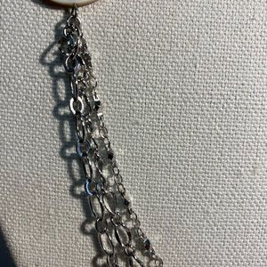 This long necklace with matching earrings screams CLASSY!! This triangular and circular pearl accents with pebble-like pieces and clear beads with the silver links is gorgeous. Has 3 different mm oval silver strands that hang at the bottom and accents the piece around the neck. Hangs approx 24-26 inches