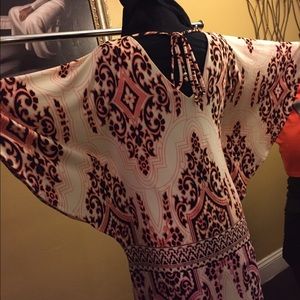 Pretty Print Flutter Sleeve Dress. String Tie at top open back. Slight Stretch, Lined Med-Weight Material 36in from shoulder