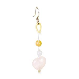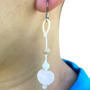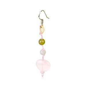 The pretty Rose Quartz Heart Earrings use the naturally beautiful contrast of dark green and light pink to create their delicate appearance. The earrings feature a drop cord that is baby pink to match the rose quartz charm at the bottom. Two jade beads are suspended on the middle part of the cord.