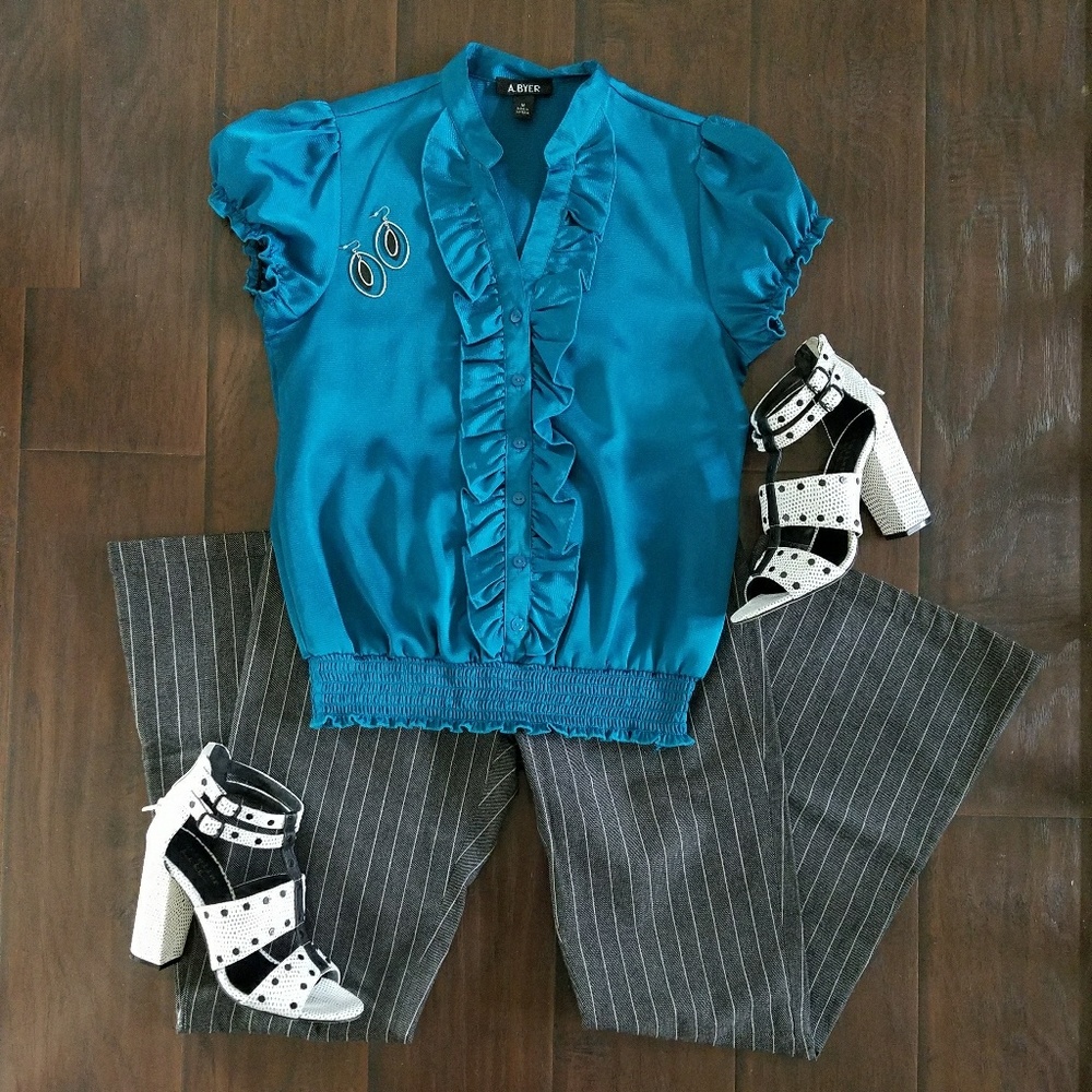This pretty teal shirt by A. Byer features a shiny fabric & ruffle detail at the front. Perfect for work or a nice occasion. Only worn once. The pants are also for sale. Bundle & save!
