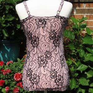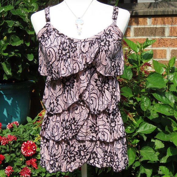 Pale pink and black with lovely ruffles. Straps are adjustable. Size is small. 100% rayon. Armhole to armhole laying flat is 15". Length is 28". Minimally worn, perfect condition, no flaws.