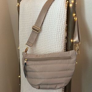 Our Jolie Puffer Crossbody Bum Bag is an updated version of the original fanny pack that can be worn in multiple ways. This quilted belt bag can be worn as a belt bag/fanny pack, crossbody bag, or shoulder bag. Featuring a unique half moon shape in a quilted puffer poly fabric. Gold hardware with a fun ribbon accent on the zipper finish off this popular design. This is one of our highest sell through designs and a must have for your boutique! We are obsessed with this style, it holds so much and the front zipper makes for really easy access to all of your necessities!