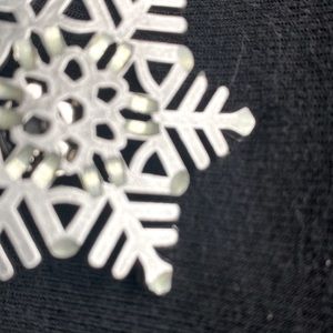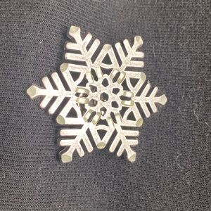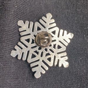 Pretty snowflake pin. Pewter in color. Attach to your outfit or coat with the “pinback” shown in picture #3. Simple but elegant. Box is included.