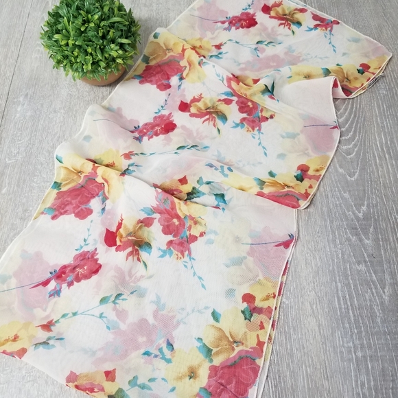 This is a pretty Springtime scarf that's full of color! Pair with a blouse, dress up a denim jacket...this beautiful scarf will add a pop to whatever you choose! Wonderful condition with only 1 tiny call out pointed out in photo.....13 X64