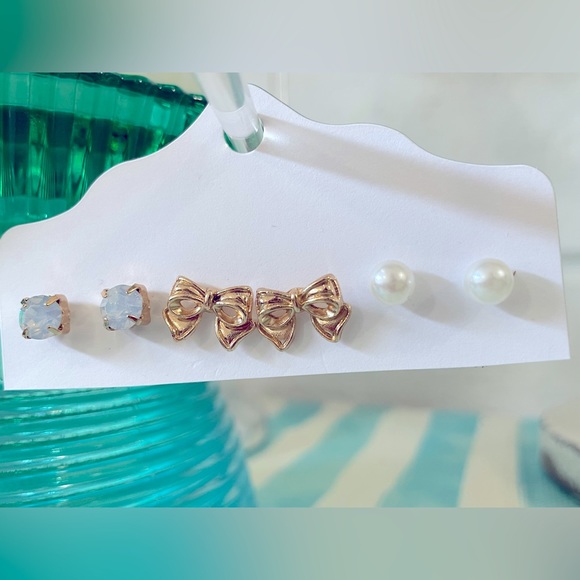 Lovely set of 3 pair of classic earring studs, white pearl color, opalescent and goldtone colored bows. Great buy for all 3 pair ! NWOT
