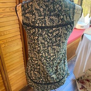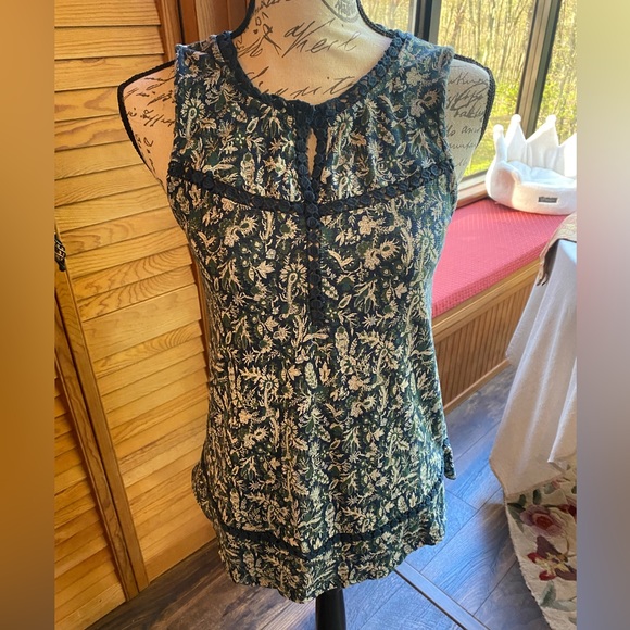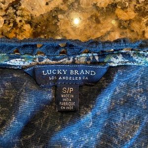 Blue, green, and white pattern tank with crochet detail. This is a very stylish tank from Lucky. I cut the care tags off as they were annoying. This is a smoke free home.