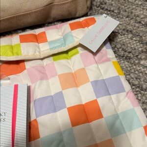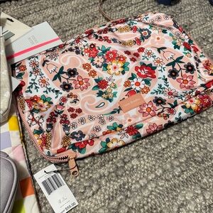 Canvas tote with 'Live Love Shop' print. Includes colorful pouch, notebook, and sticky notes.