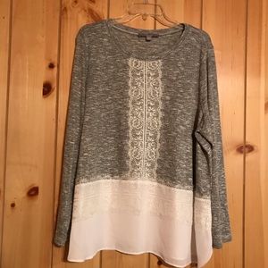 Lightweight, comfy, feminine top with lace detailing. Silky white on the bottom. Sized 2X but fits more like a 1X. Never worn