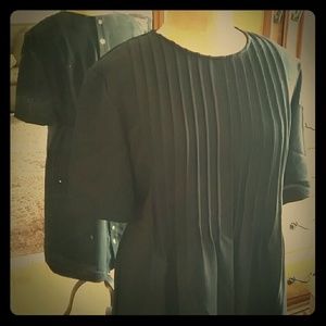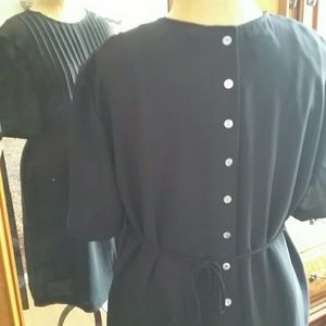 Versatile dress with feminine details! Front features pintuck pleating at the bodice and a round neckline. The back has petite mother of pearl buttons top to bottom and long ties at the waist for gentle shaping. Fully lined.