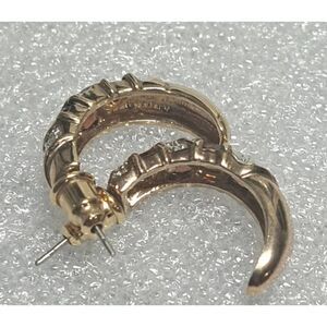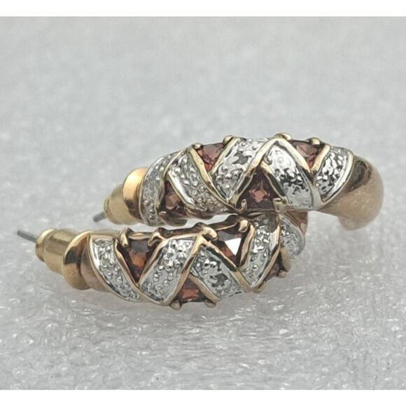 Pretty Vintage earrings in excellent pre-owned condition. Done in a half hoop "J" design, they feature genuine trillion cut garnet gemstones and pave set genuine diamond accents. With push back post closures, they are done in a buttery 14k yellow gold plate finish.