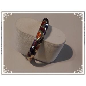 This multicolor enamel design is perfect for adding a touch of beauty to any outfit. It is hinged bracelet for easy wear and has a magnetic closure. Measuring 7 inches in length, this bracelet is stackable with other bangles for a trendy look. The bracelet is in its original undated excellent condition.