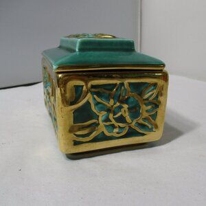 Pretty Vintage Green & Gold Lidded Ceramic Scraffito Design Box