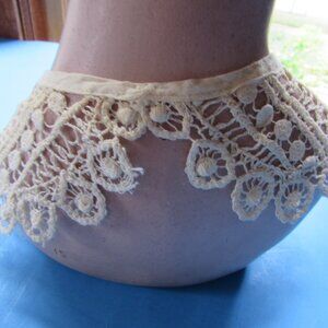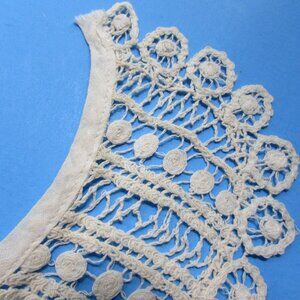 Pretty vintage detachable ladies collar in white embroidered lace. The edges are spoked circles. The collar is panels of open work alternating with attached circles. We are placing this mid-century