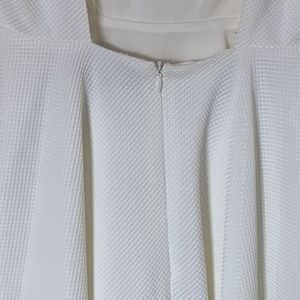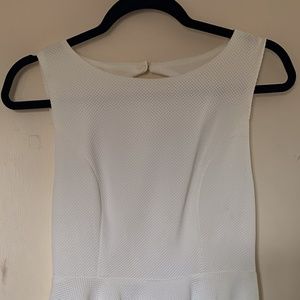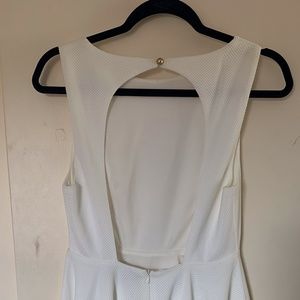 Gorgeous Dress with a beautiful open back. It falls right above the knee and has a cute zipper that is barely seen and a pretty gold pearl button at the top. This dress has never been worn and comes with an extra peral button.