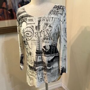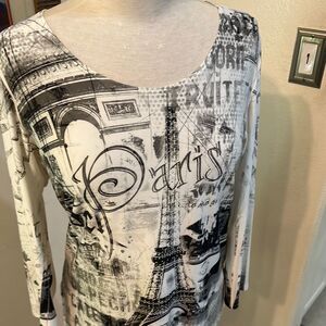 Stylish women's top featuring a chic Paris print. Perfect for casual outings or a day in the city. Stretchy material for comfort. Tiny shiny stones embellish the Eiffel Tower making it stand out. Excellent condition!